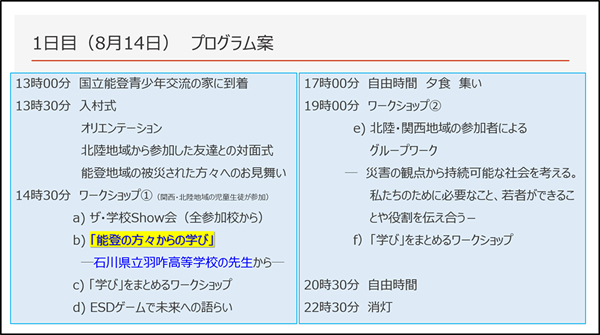 | 実施日 | 2024年8月14日(水)午後~8月15日(木)午前(一日参加/宿泊参加可能) |